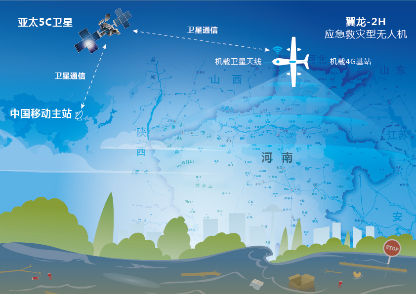 在這千鈞一髮之際,翼龍-2H應急救灾型無人機飛赴河南上空執行灾情偵查和通信中繼任務,為受灾群眾提供對外通訊服務。無人機攜帶一個4G手機移動通信基站,和地面基站一樣提供手機信號;同時無人機上裝配了一個衛星通信天線指向衛星,通過衛星回傳連結建立了和移動通信主站之間的連接,為災區群眾接通手機通信服務。
